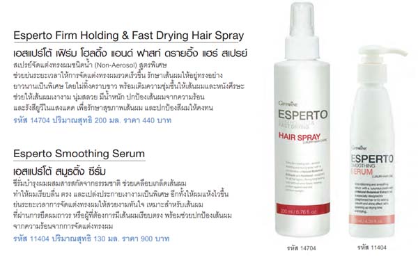 กิฟฟารีน เอสแปร์โต้ สมูธติ้ง ซีรั่ม เซรั่มบำรุงผมผสมสารสกัดจากธรรมชาติ ซึ่งมีคุณสมบัติเสมือนซิลิโคนชั้นสูง มีน้ำหนักเบา ช่วยเคลือบเกล็ดเส้นผม ทำให้ผมเรียบลื่นตรงและเปล่งประกายเงางามเป็นพิเศษ อีกทั้งให้ผมแห้งไวขึ้น ย่นระยะเวลาการจัดแต่งทรงผมให้สวยงามทันใจ เหมาะสำหรับเสันผมที่ผ่านการยืดผมถาวร หรือผู้ที่ต้องการมีเส้นผมเรียบตรงพร้อมช่วยปกป้องเสันผมจากความร้อนจากการจัดแต่งทรงผม