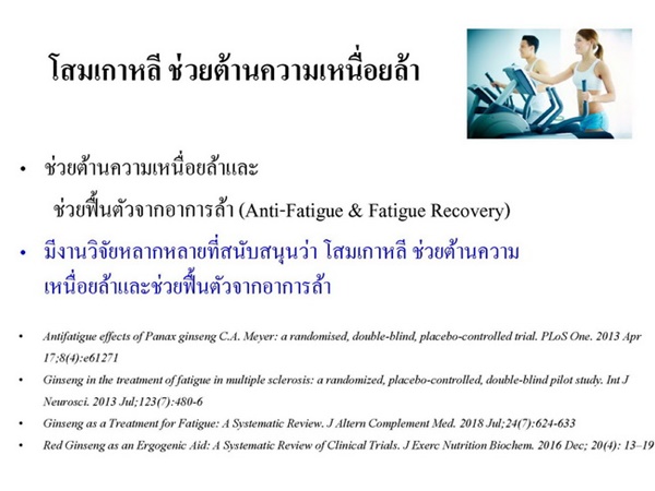 โสมเกาหลีช่วยในเรื่องโรคปอดเรื้อรัง COPD โสมเกาหลี มีสรรพคุณช่วยในเรื่องโรคปอดเรื้อรังชนิดที่ พบบ่อยที่สุด คือโรคถุงลมโป่งพอง (COPD) โรคนี้พบได้ บ่อยมาก เพราะเป็นผลของการสูบบุหรี่ติดต่อกันมาเป็น ระยะเวลานาน งานวิจัยของโสมแบบการทดลองที่มี กลุ่มควบคุมชัดเจนได้ท าให้ผู้ป่วยโรคถุงลม โป่ง พอง 92 คนแบ่งเป็นกลุ่มวิจัยที่ได้สารสกัดโสม วนัละ 200 มก. 49 คน และกลุ่มควบคุม ได้รับยาหลอก อีก 43 คน เป็นเวลา 3 เดือน พบว่า กลุ่มที่ได้รับโสม มี สมรรถภาพทางปอดดีขึ้นอย่างมากในทุกด้าน โดยที่ไม่มีผลข้างเคียง แต่กลุ่มที่ได้รับยาปลอมไม่มี ผลดีขึ้น แต่อย่างใด ดังนั้นถ้าจะทานโสมในผู้ที่เป็นโรคนี้ ก็น่าจะเกิดประโยชน์