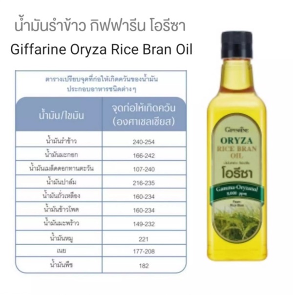 กิฟฟารีน น้ำมันรำข้าว โอรีซา Oryza Rice Bran Oil เป็นน้ำมันผัดๆ ทอดๆ ที่ดีต่อสุขภาพเพราะเป็นน้ำมันที่มีไขมันอิ่มตัวน้อย เมื่อเทียบกับน้ำมันหลายๆ ชนิดที่มีอยู่ในท้องตลาด ซึ่งประโยชน์ของน้ำมันชนิดนี้จะป้องกันโรคไขมันอุดตันในเส้นเลือดได้อีกด้วย
