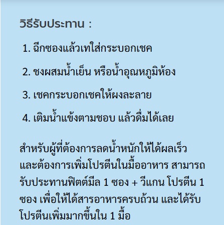วิธีรับประทาน : ฟิตต์มีล 1 ซอง ต่อน้ำ 250 มิลลิลิตร เชคในน้ำอุ่น น้ำเย็นหรือน้ำอุณหภูมิห้อง (ไม่แนะนำเชคกับน้ำร้อน) รับประทานทดแทนมื้ออาหาร วันละ 1-2 ครั้ง (เมื่อผสมแล้ว แนะนำให้ดื่มทันที)