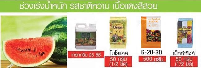 การปลูกแตงโมให้แตงโมลูกดก ลูกโต แข็งแรง ผิวดี เนื้อแน่น เนื้อแตงโมมีสีแดงสด น้ำหนักดี โดยให้ปุ๋ยทางดินทางระบบน้ำ ในระยะบำรุงต้นให้ปุ๋ยสุตร 16-16-16 อัตรา 25 กิโลกรัม ผสมกับปุ๋ยสูตร 24-7-7 อัตรา 5 กิโลกรัม ต่อมาระยะจับดอกแตงโม ใช้ปุ๋ยสูตร 8-24-24 อัตรา 10 กิโลกรัม สุดท้ายระยะบำรุงผลใช้ปุ๋ยสูตร 14-14-21 อัตรา 25 กิโลกรัม และผสมเทอร์โบไทโอแม็กซ์ อัตรา 300 ซี.ซี ต่อน้ำ 200 ลิตร เฉลี่ย 10-15 วันต่อครั้ง